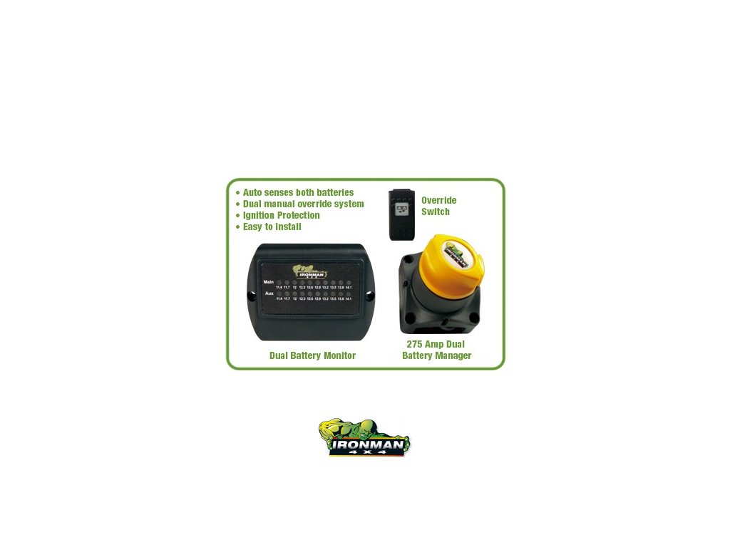 Be sure that you always start. With Dual Battery kit. High Amp. Dual sensing. Automatic function. Cut in when main battery above 13.7V. Isolates main battery below 12.2V. Dual manual override. Additional override switch. Sliding plate contacts. Ignition protection. All hardware included. Monitor dims with headlights on. Fully sealed. Easy to install. Without wiringAdditional parameters