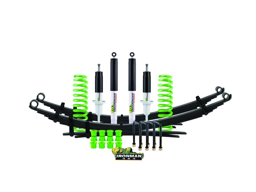 Lift: + 45 mm, Additional load: + 100/300++ kg, (front/rear). Ironman 4×4 offer a complete integrated range of suspension kits, designs which have evolved over 50 years of suspension experience. Ironman 4×4 recognise that there is no single solution practical for the varying needs of 4×4 owners and different driving conditions, therefore Ironman 4×4 offer a wide selection of matched components, once fitted will transform the vehicle around the drivers needs. SUSPENSION KIT CONTENTS: Shock Absorbers, Front coil springs, Rear leaf springs, Polyurethane leaf spring bushes, U-bolts, Centre driveline spacer. Price for: set.Additional parameters