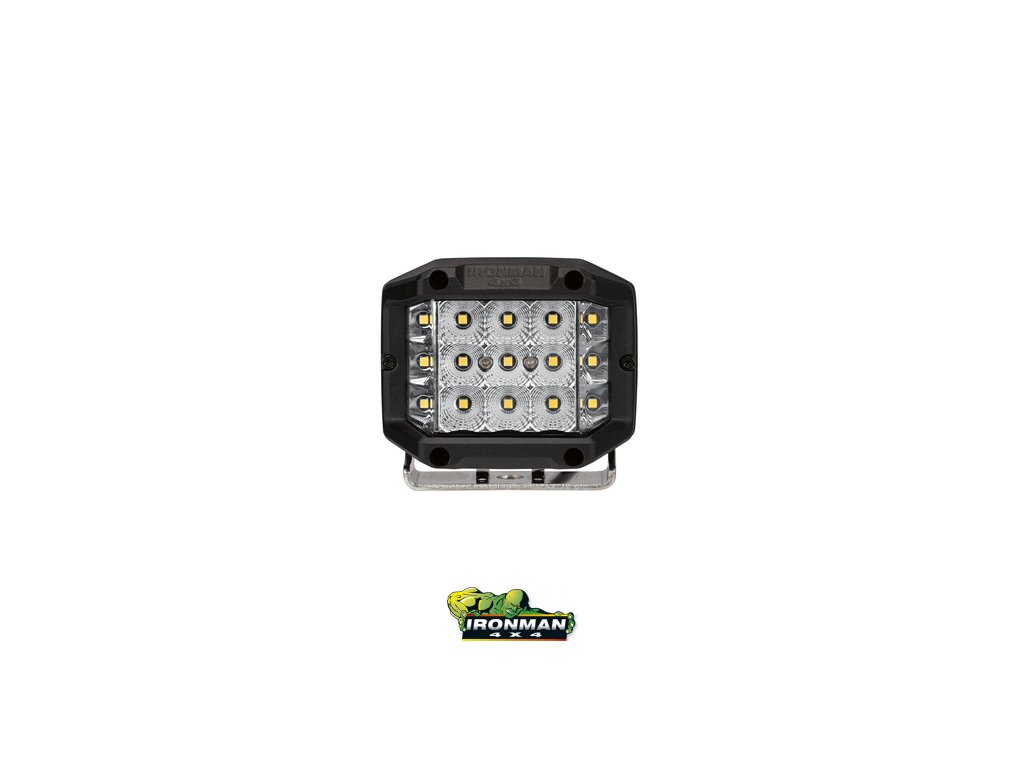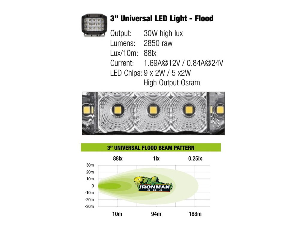 Ironman 4x4’s 3" Universal LED Light with Side Shooters are designed and engineered to meet the demanding conditions of off road and on road travel, providing 140 degrees of light. Using the latest technology, featuring Osram LED’s these lights are brighter and more efficient than ever before, increasing visibility and reaction time - keeping you and your passengers safer. Manufactured from diecast alloy housing built to withstand hours of corrugations and extreme conditions, featuring shockproof polycarbonate lenses and high-quality reflectors for ultimate performance. 6000K white light to imitate natural daylight.Featuring 3W high lux output Osram LED's.Output: 30W high lux.Rated to IP67.Capable of submersion and high pressure water blasts.Operating voltage 10-30V DC.Lumens: 2850 raw.Lux/10m: 88lxCurrent: 1.69A@12V / 0.84A@24VLED Chips: 9x2W / 5x2WAdditional parameters