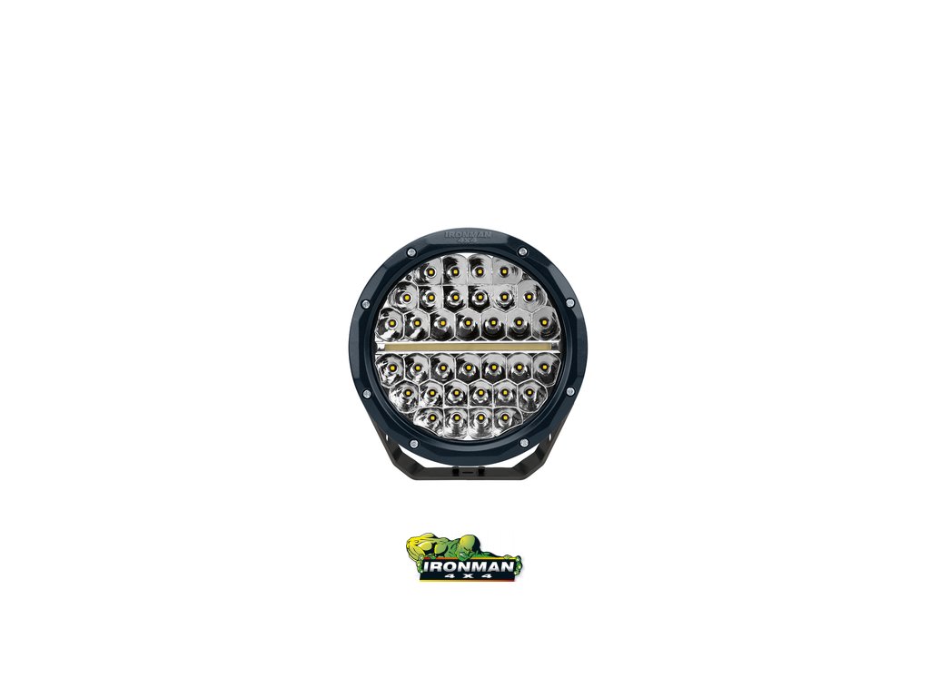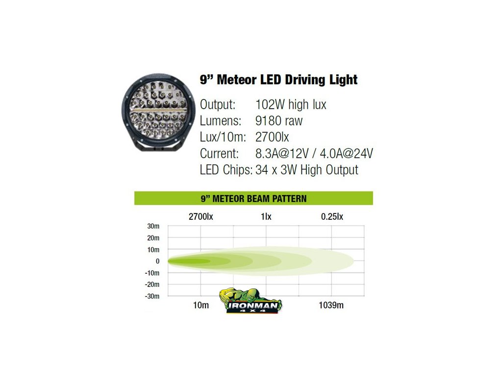 Ironman 4x4’s 9" Meteor driving lights with daytime running lights are designed and engineered to meet the demanding conditions of off road and on road travel. Using the latest technology, featuring Osram LED’s these lights are brighter and more efficient than ever before, increasing visibility and reaction time - keeping you and your passengers safer. Manufactured from diecast alloy housing built to withstand hours of corrugations and extreme conditions, featuring shockproof polycarbonate lenses and high-quality reflectors for ultimate performance. 6000K white light to imitate natural daylight.Featuring 3W high lux output Osram LED's.Output: 102W high lux.Rated to IP67 and IP69.Capable of submersion and high pressure water blasts with complete protection from dust.Operating voltage 10-30V DC.Lumens: 9180 raw.Lux/10m: 2700lxCurrent: 8.3A@12V / 4.0A@24VLED Chips: 34x3WAdditional parameters