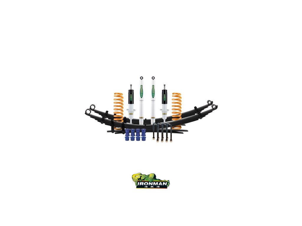 Lift: + 40 mm, Additional load: + 80/300 kg, (front/rear). Ironman 4×4 offer a complete integrated range of suspension kits, designs which have evolved over 50 years of suspension experience. Ironman 4×4 recognise that there is no single solution practical for the varying needs of 4×4 owners and different driving conditions, therefore Ironman 4×4 offer a wide selection of matched components, once fitted will transform the vehicle around the drivers needs. SUSPENSION KIT CONTENTS: Shock Absorbers, Front coil springs, Rear leaf springs, Polyurethane leaf spring bushes, U-bolts, Centre Bearing Spacer Kit, Brake Hose Relocation Kit. Price for: set.Additional parameters