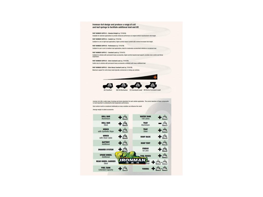 Lift: + 45 mm, Additional load: + 300++ kg, Ride will be firmer than original by around 20% and suits light to medium loads. This spring is recommended when the given load may be occasional or temporary. Excellent for vehicles which have some accessories fitted. All Ironman Springs are designed to provide vehicle lift over standard. For Leaf Springs expect at least 50mm and for Coil Springs expect 40mm minimum. IFS or IRS (Independent Suspension) equipped vehicles generally lift around 35mm. Ironman 4x4 Suspension can be supplied to suit different driving styles; comfort, performance ﹠ constant load. Qty req: 2 pc, Price for: 1 pc,Additional parameters