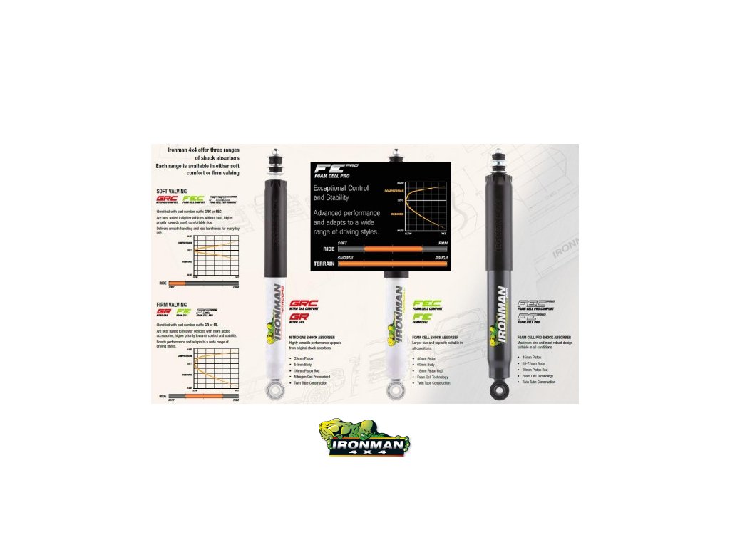 Zdvih: + 0-45 mm, Tlmiče pre profesionálne a športové využitie. Dvojplášťový obal, 45mm priemer piestu. Najrobustnejšie tlmiče pre 4x4 na trhu. Vonkajší obal hrúbky 3mm. Plne repasovateľné. Tieto tlmiče ponúkajú podobný pocit z jazdy ako štandardné tlmiče s dusíkovým plynom. Pri tejto technológii je však možné použiť väčší piest a teda zároveň aj väčšie vŕtanie, čo dovoľuje použitie väčšieho množstva oleja. Toto všetko umožňuje tlmiču pracovať pri nižšej teplote, čo príde vhod práve v najťažších off-roadových podmienkach, alebo pri dlhotrvajúcej jazde zvlneným terénom. Tlmiče Ironman Foam Cell s 45mm piestom boli vyvinuté pre ten najlepší výkon v segmente 4x4, pri náročných a rôznorodých podmienkach mimo ciest. Tlmiče s penovými bunkami sú taktiež schopné ponúknuť komfortnú jazdu na cestách. - 65-72mm vonkajší priemer - 45mm priemer piestu - 20mm chrómovaná piestnica - 3mm hrúbka vonkajšej steny - 360° zvary- plne repasovateľný- Nastaviteľná výška pri STRUT tlmičoch- Integrovaný doraz- Dvojplášťová konštrukcia Potrebný počet: 2 ks, Cena za: 1 ks,